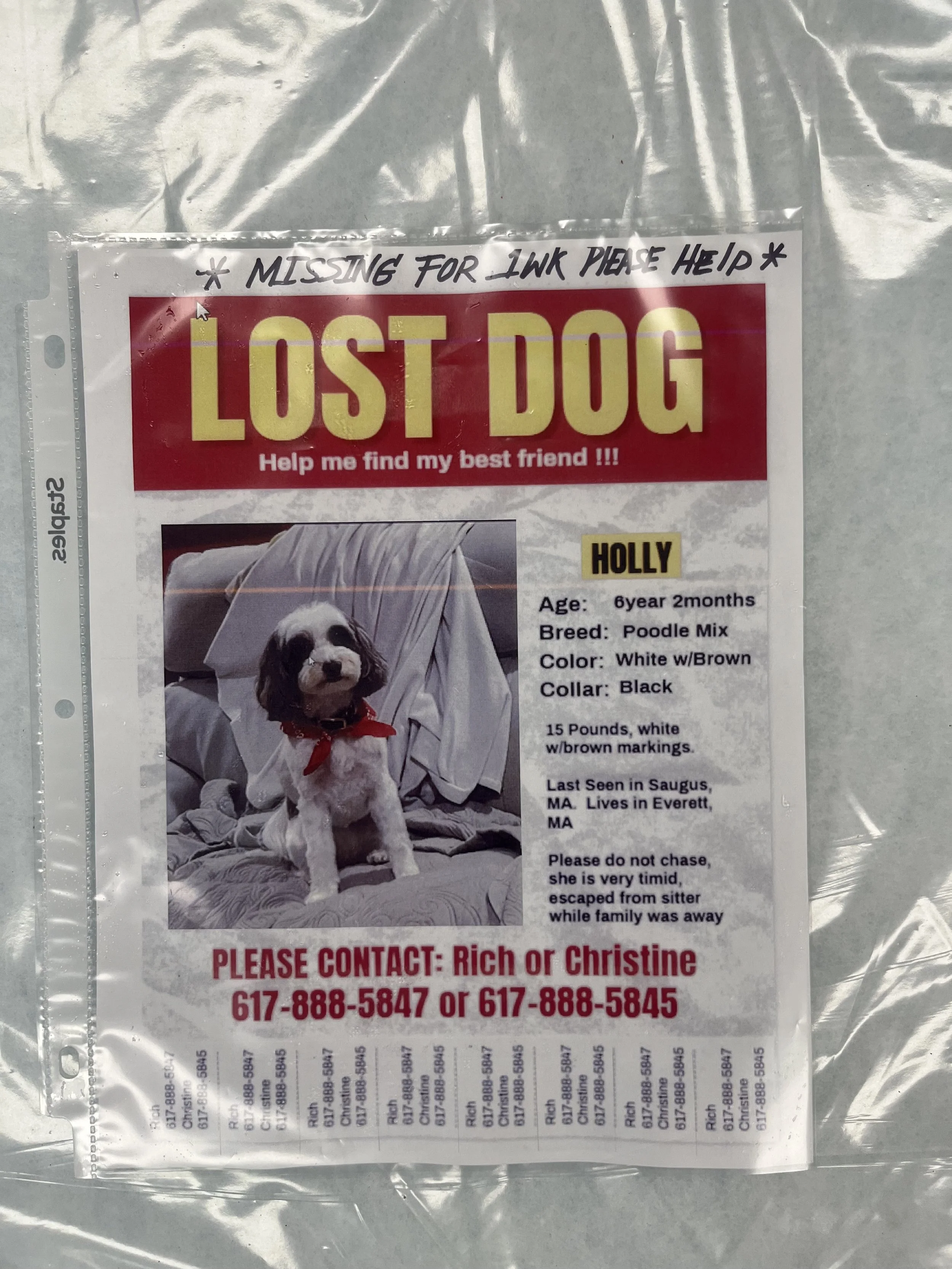 A dog named Holly has been missing for over a week. She is a 6-year, 2-month-old poodle mix. Holly is white with brown markings and weighs 15 pounds. She was last seen in Saugus, Massachusetts, but lives in Everett, MA. She may be wearing a black collar.